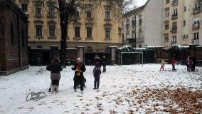 Felhőtlen játék és örömködés a rég várt hóban az iskolaudvaron. |